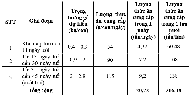 Tất cả nguồn thức ăn tại trang trại được Công ty CP Japfa Comfeed Việt Nam cung cấp định kỳ 5 ngày/lần. Nhu cầu về thức ăn cung cấp cho gà thịt theo từng giai đoạn phát triển của gà như sau: