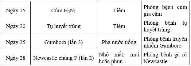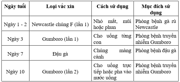 - Sử dụng vắc xin cho gà: Loại và thời điểm sử dụng vắc xin được xem xét sao cho đảm bảo tuyệt đối an toàn cho đàn gà dựa trên lịch dùng chung và lịch điều chỉnh cho phù hợp với điều kiện cụ thể của khu vực.