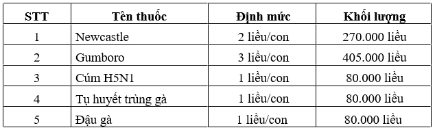 - Nhu cầu vắc xin, thuốc thú y: Thuốc thú y, vắc xin trong chăn nuôi có một vai trò hết sức quan trọng để đảm bảo an toàn cho con giống. Toàn bộ lượng thú y, vắc xin, vitamin,…cho con giống được Công ty CP Japfa Comfeed Việt Nam cung cấp. Định mức về nhu cầu sử dụng thuốc thú y tại trạng trại cụ thể như sau:
