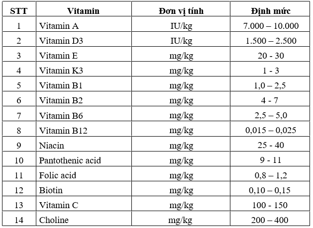 Bảng 5: Định mức về nhu cầu sử dụng vitamin cho gà