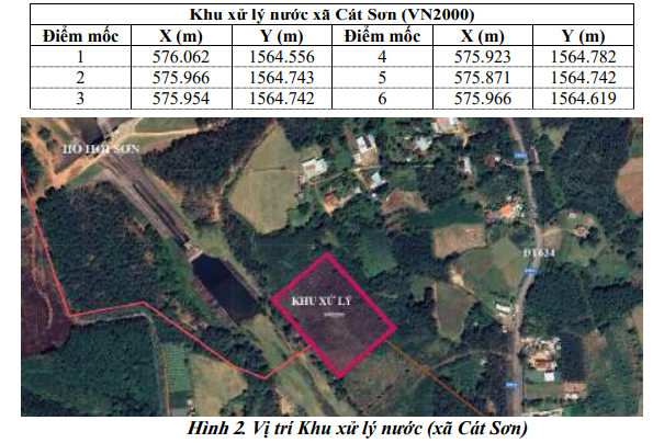 - Khu xử lý cấp nước sạch: Diện tích đất S=11.000m2 (tại xã Cát Sơn), thuộc hạ lưu tràn xã lũ hồ Hội Sơn, thửa đất số 17, 18 tờ bản đồ số 7 (bản đồ Vlap).