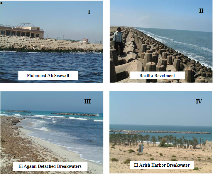 Có hai loại breakwater; loại thứ nhất là breakwater tách rời được xây dựng ở phía ngoài khơi và song song với đường bờ biển. Nó được sử dụng để phân tán năng lượng của sóng tới và tạo ra một khu vực bóng mát được bảo vệ ở phía đất liền. Loại này được sử dụng rộng rãi ở Ai Cập tại bờ biển phía tây bắc như ở Marabella và khu nghỉ dưỡng làng 6 tháng 10, và bờ biển Delta như ở Baltim, Damietta, và các khu vực El Gamil, hình (1-III). Loại thứ hai là breakwater kết nối với bờ biển, tức là nó kéo dài từ đường bờ biển ra hướng ngoài khơi. Loại công trình này được sử dụng để bảo vệ các cảng và kênh dẫn hướng khỏi tác động của sóng để tạo ra khu vực yên tĩnh cho tàu thuyền và có thể cho bơi lội. Ở Ai Cập, loại này được sử dụng tại cảng Sidi Kerair, khu nghỉ dưỡng bờ biển Sidi Kerair, cảng LNG Edku, nhà máy điện El-Arish và cảng cá El-Arish, hình (1-IV). Tất cả các công trình này gây ra vấn đề trầm tích và xói mòn ở các khu vực thượng lưu và hạ lưu tương ứng (CoRI 1998 và Frihy 2001).