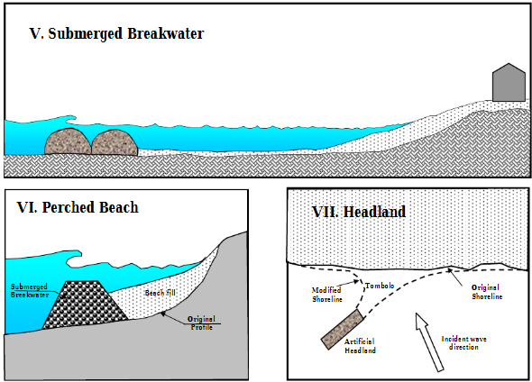 Submerged breakwaters là các cấu trúc dài hoặc ngắn ngập nước, song song với bờ biển, được xây dựng nhằm giảm thiểu tác động của sóng lên bãi biển bằng cách ép sóng vỡ trên chúng, hình (2-V). Submerged breakwaters có ít ảnh hưởng đến môi trường ven biển và không làm hỏng cảnh quan. Chúng có nhiều loại và hình dạng khác nhau như breakwaters đỉnh rộng, breakwaters đỉnh hẹp và breakwaters rạn san hô.