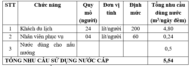 Theo Tiêu chuẩn TCVN 4513:1998 – Cấp nước bên trong – tiêu chuẩn thiết kế thì tổng nhu cầu sử dụng nước của Cơ sở được thể hiện ở bảng dưới đây: