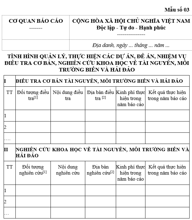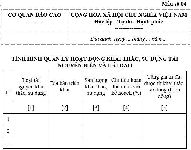 Mẫu báo cáo tình hình quản lý tổng hợp tài nguyên và bảo vệ môi trường biển và hải đảo